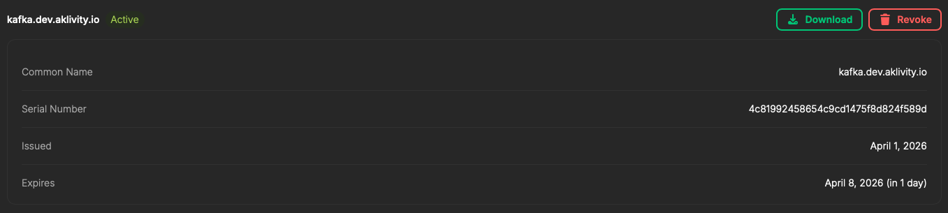 When your endpoint is backed by a mTLS-enabled Kafka cluster, the CN you assign here must match the Kafka principal configured in your ACLs. The gateway presents the same CN to Kafka, so access control is applied consistently end-to-end.