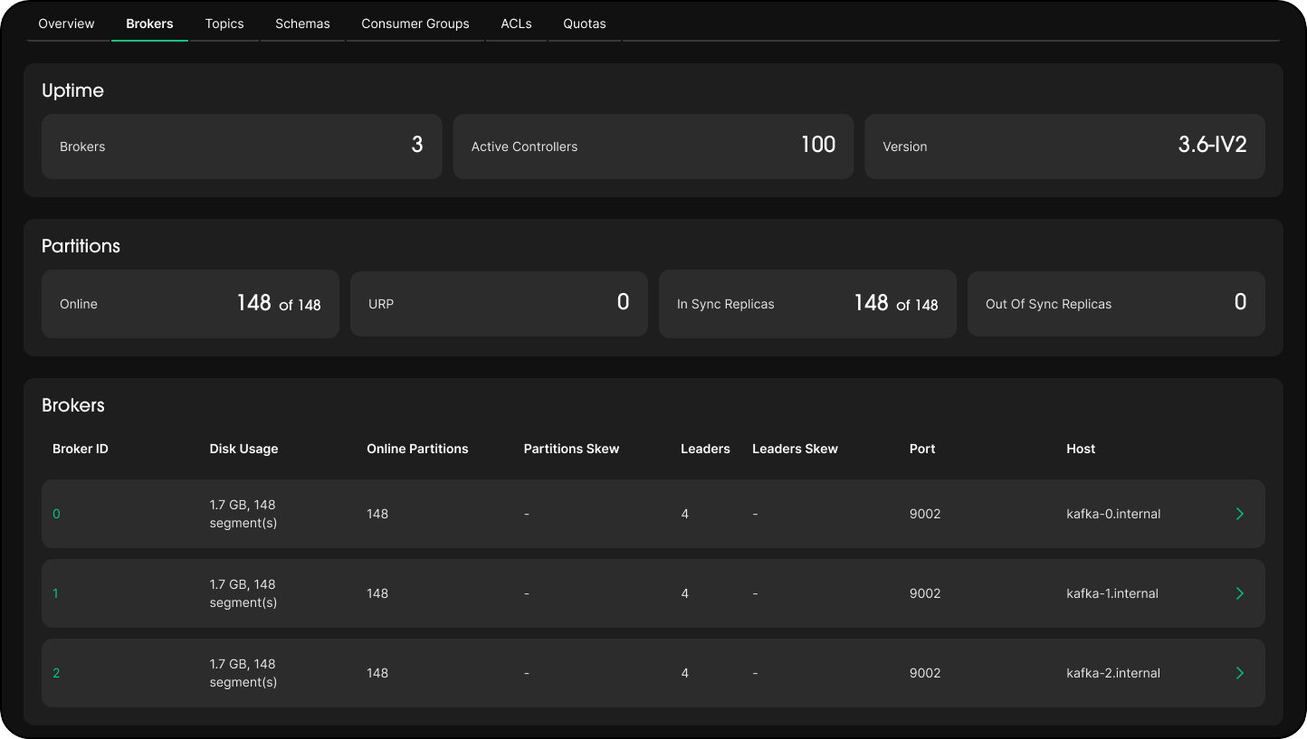 - Brokers Details: Disk usage, number of leaders, partition balance, port, and host information.