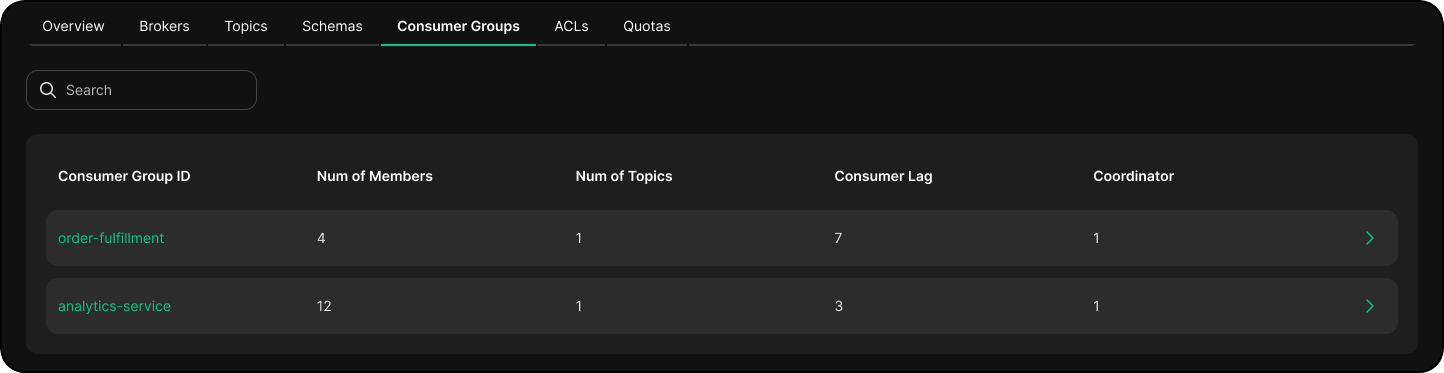 Use this view to identify lagging consumers, balance workloads, and verify group health.