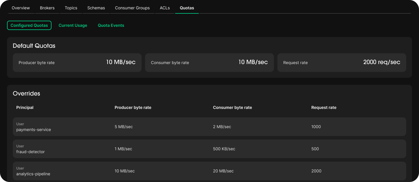 - Default quotas for the entire cluster (producer, consumer, and request rates)