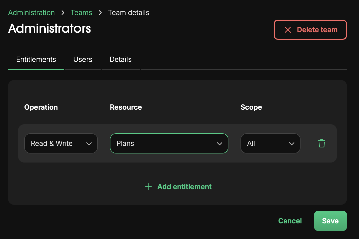 Entitlements are defined at team level, specifying the operations, resources, and scopes applicable to their role in the platform.